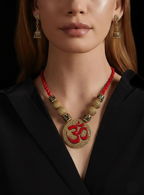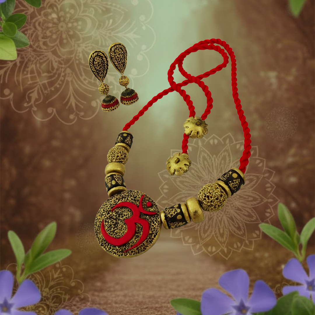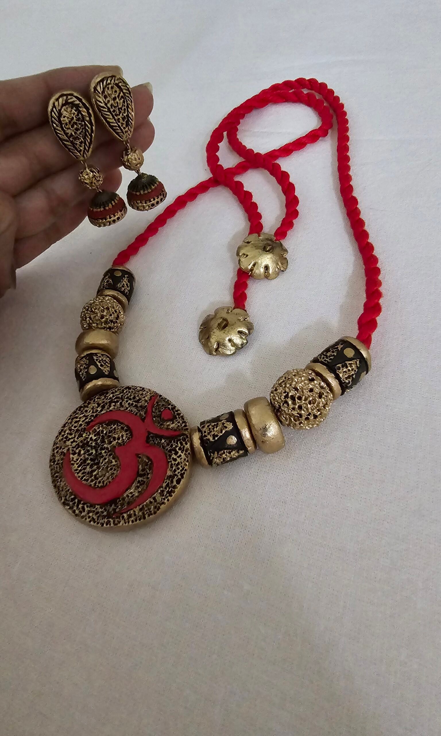 The necklace, measuring 14 cm, features intricately sculpted terracotta elements finished in a powerful palette of red, gold, and black tones, creating depth, contrast, and visual richness. Complemented by bold yet balanced 4.8 cm earrings, the ensemble offers a striking silhouette without overwhelming the wearer. The necklace is completed with an adjustable cotton string at the back, ensuring comfort, flexibility, and lightweight wear throughout the day.