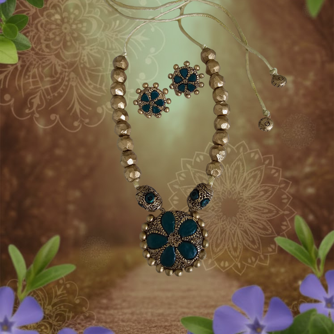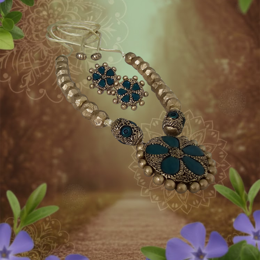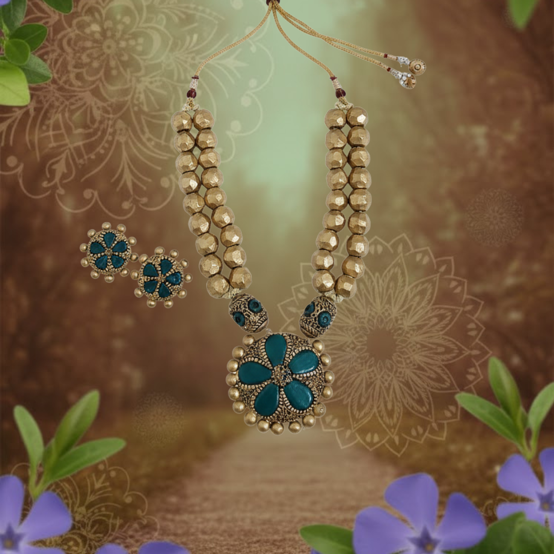 The necklace, measuring an impressive 30 cm, showcases detailed terracotta craftsmanship finished in an opulent blend of green and gold tones, creating a regal visual rhythm across the neckline. Paired with delicately proportioned 3 cm earrings, the ensemble achieves perfect harmony between grandeur and grace. For comfort and adaptability, the necklace is finished with an adjustable cotton string at the back, ensuring a secure yet lightweight fit.