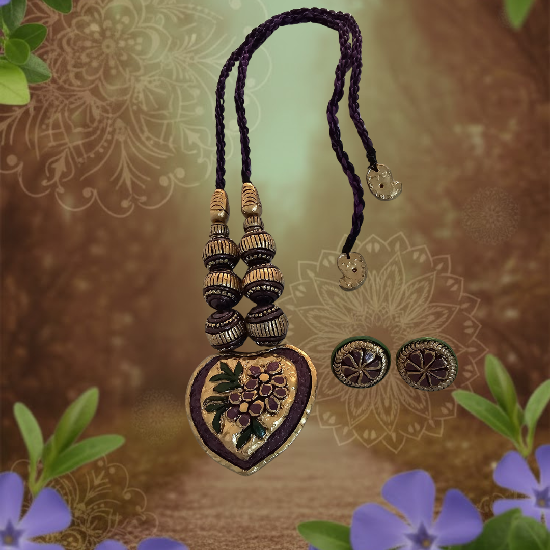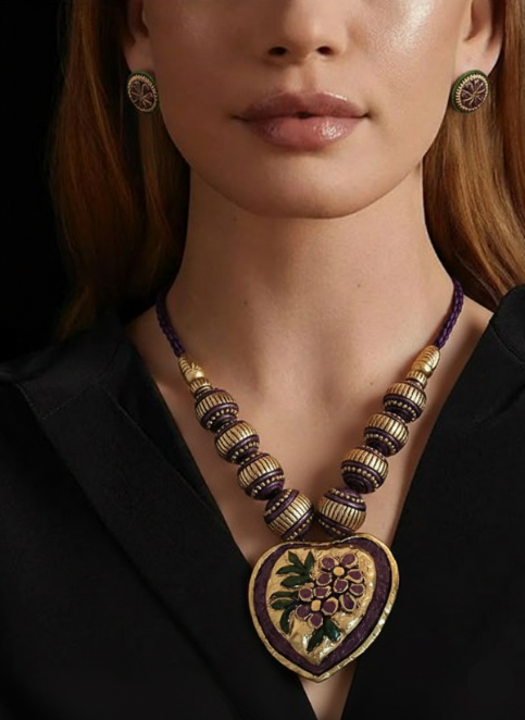 The necklace, measuring 18 cm, features intricate terracotta detailing in gold, purple, and green tones, paired with matching 2.4 cm earrings that complete the ensemble with balanced elegance. Designed for both style and comfort, the necklace includes an adjustable cotton string at the back, ensuring a perfect and customizable fit while preserving the lightweight wearability of terracotta jewelry.