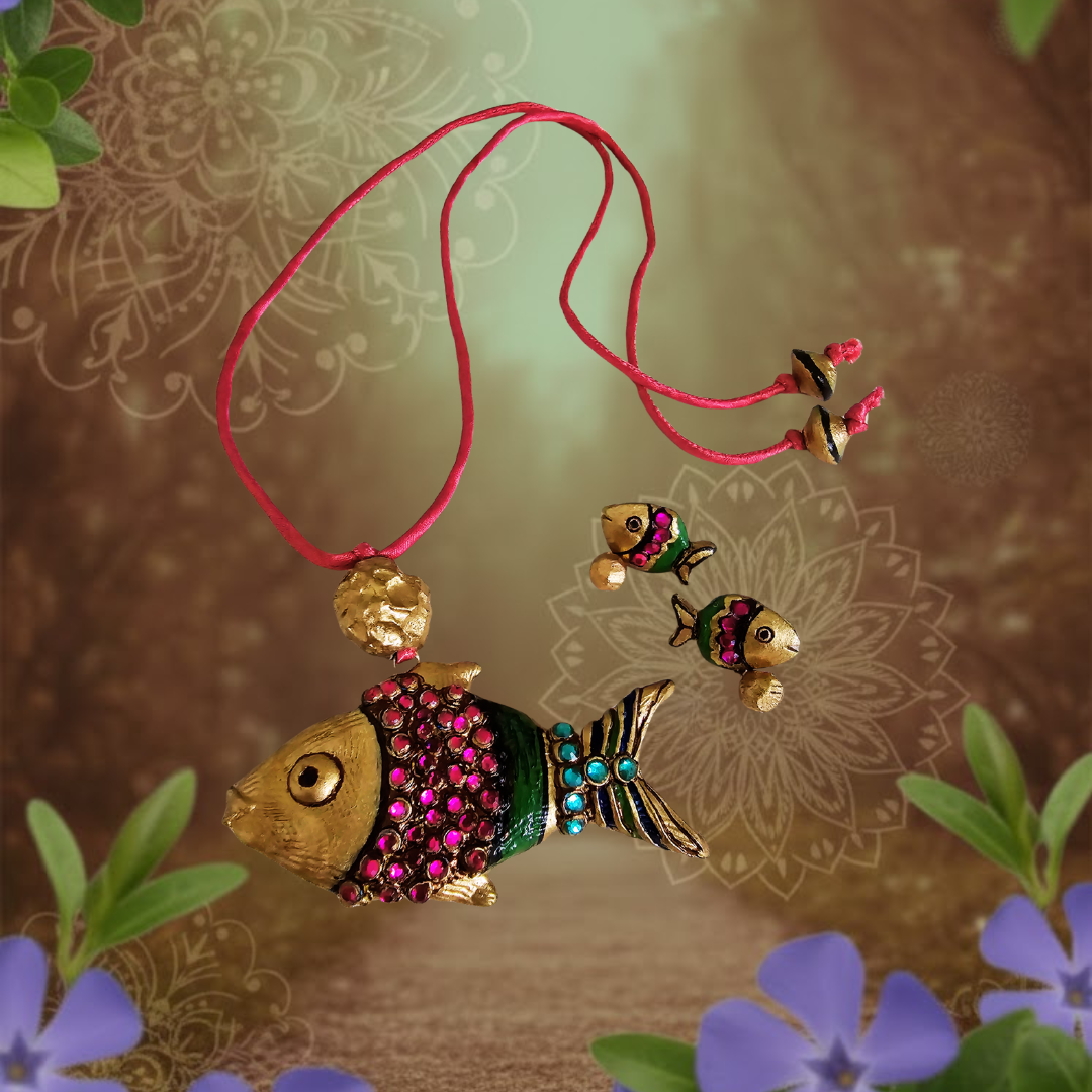 The necklace, measuring 6 cm, is adorned with meticulously handcrafted terracotta motifs in a harmonious multicolour palette, reflecting vibrant charm and artistic precision. Complementing the necklace are elegantly sized 2.5 cm earrings, designed to maintain balance while enhancing the ensemble’s bold presence.
