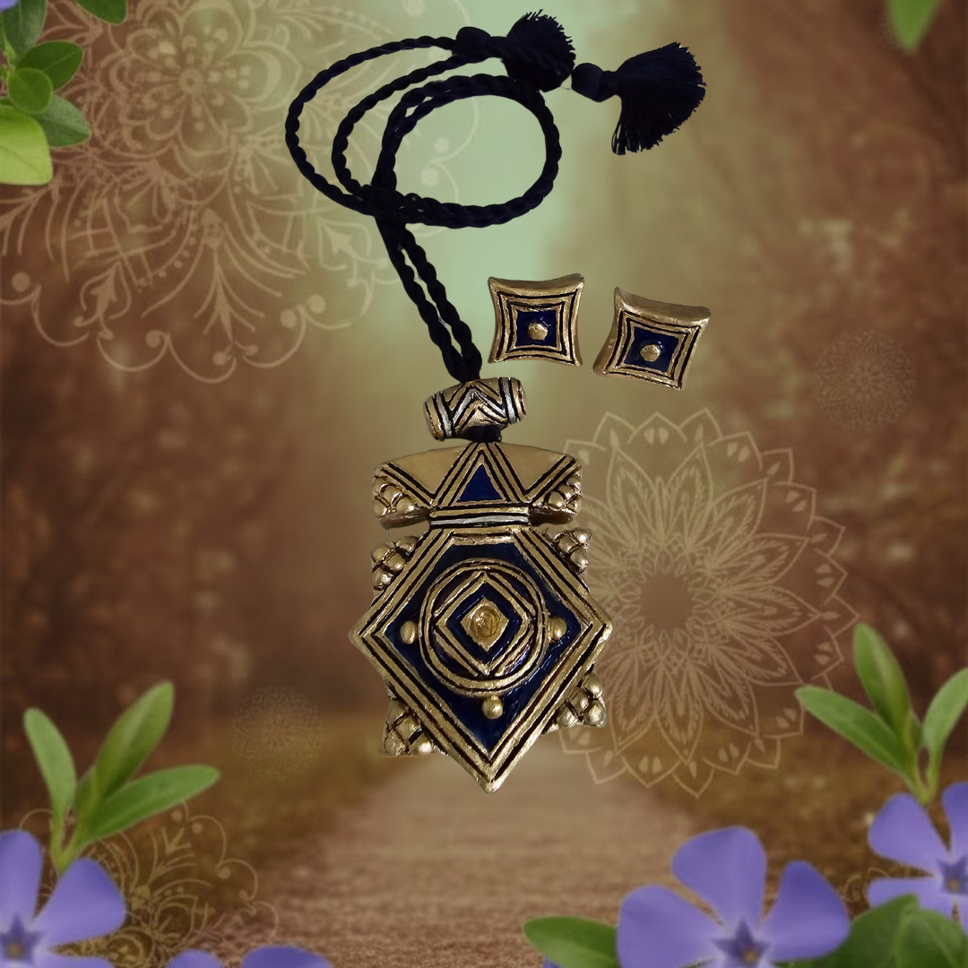 The necklace, measuring 8.5 cm, is adorned with finely detailed terracotta elements in Yellow, Gold, and Navy Blue tones, evoking warmth, depth, and sophisticated contrast. Complementing the necklace are delicately sized 2 cm earrings, crafted to mirror the intricate designs of the necklace while enhancing the overall elegance and balance of the set.