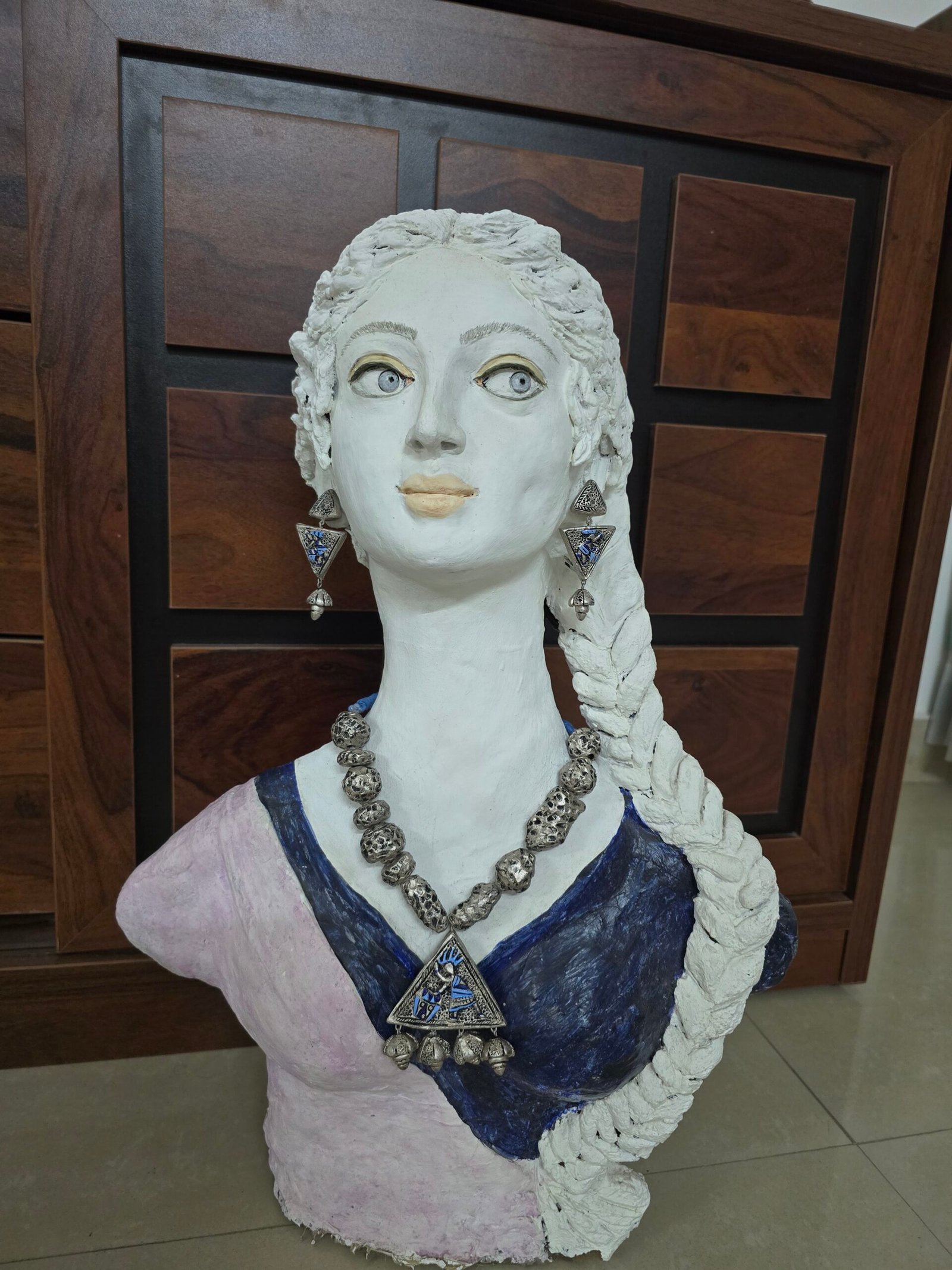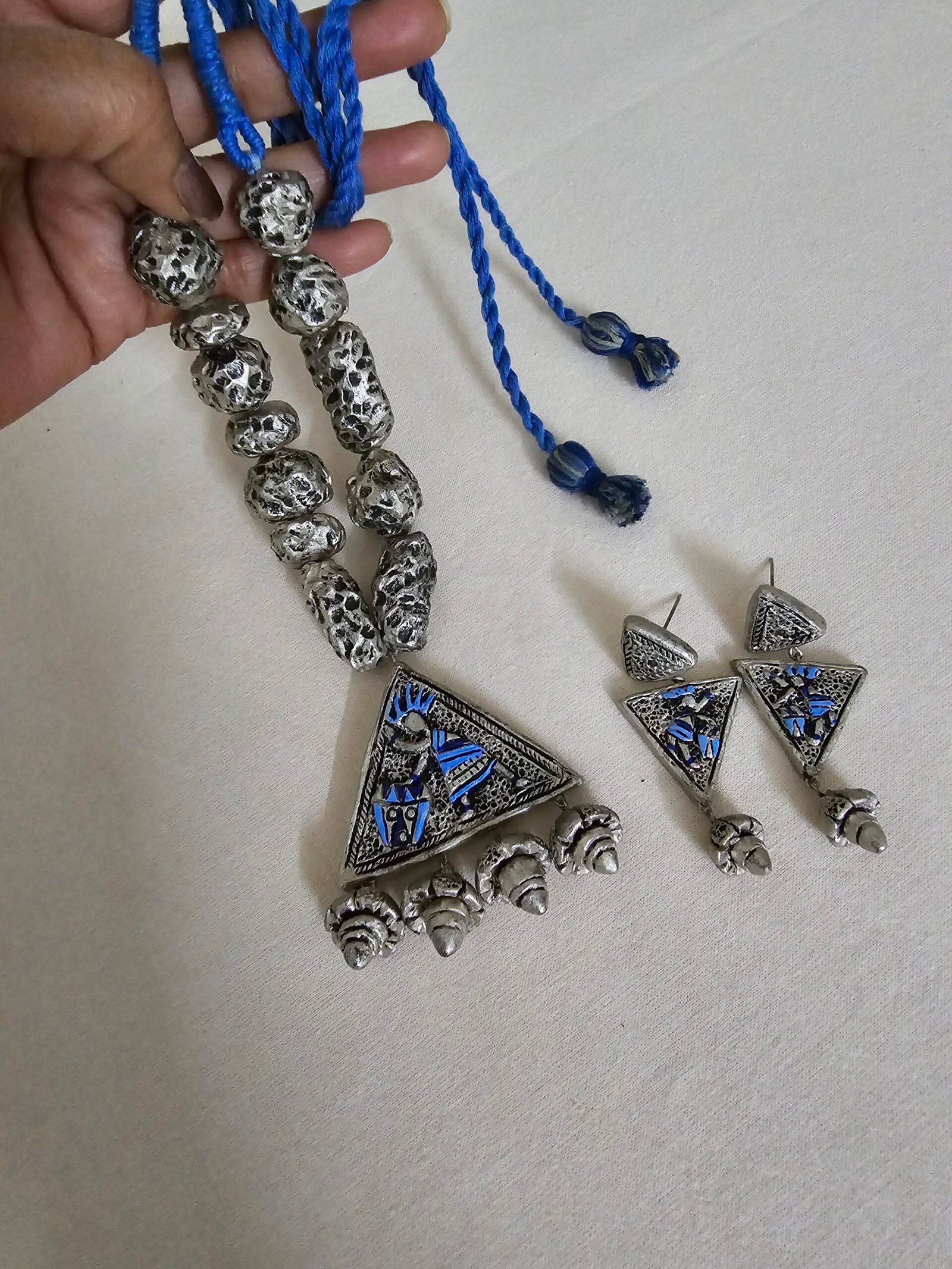 The necklace, measuring 36 cm, features intricately handcrafted terracotta elements in a sophisticated blend of Silver and Blue, evoking refined luxury and visual harmony. Complemented by bold 6.5 cm earrings, the set frames the face gracefully, offering a balanced yet striking silhouette that commands attention without overpowering the ensemble.
