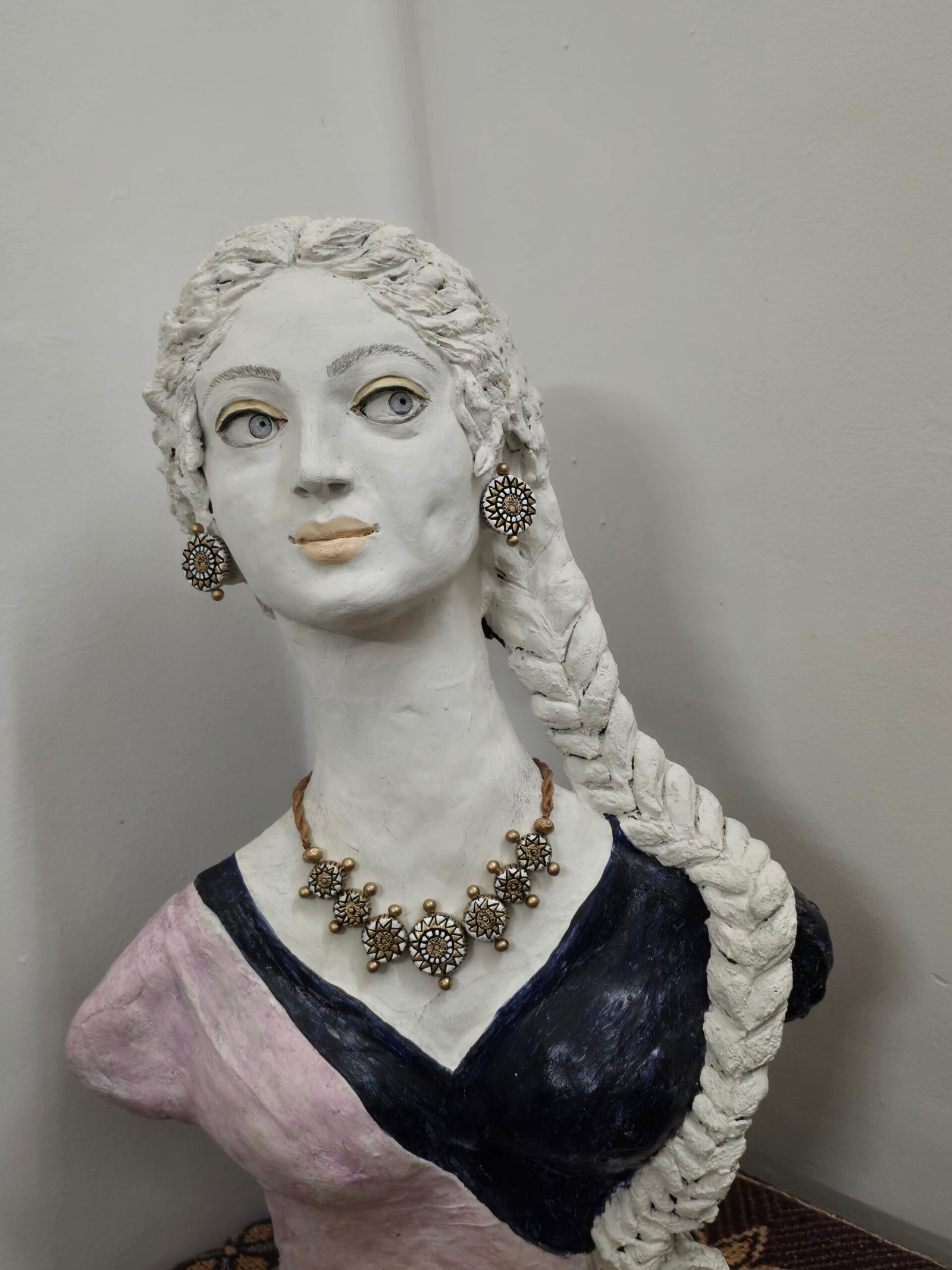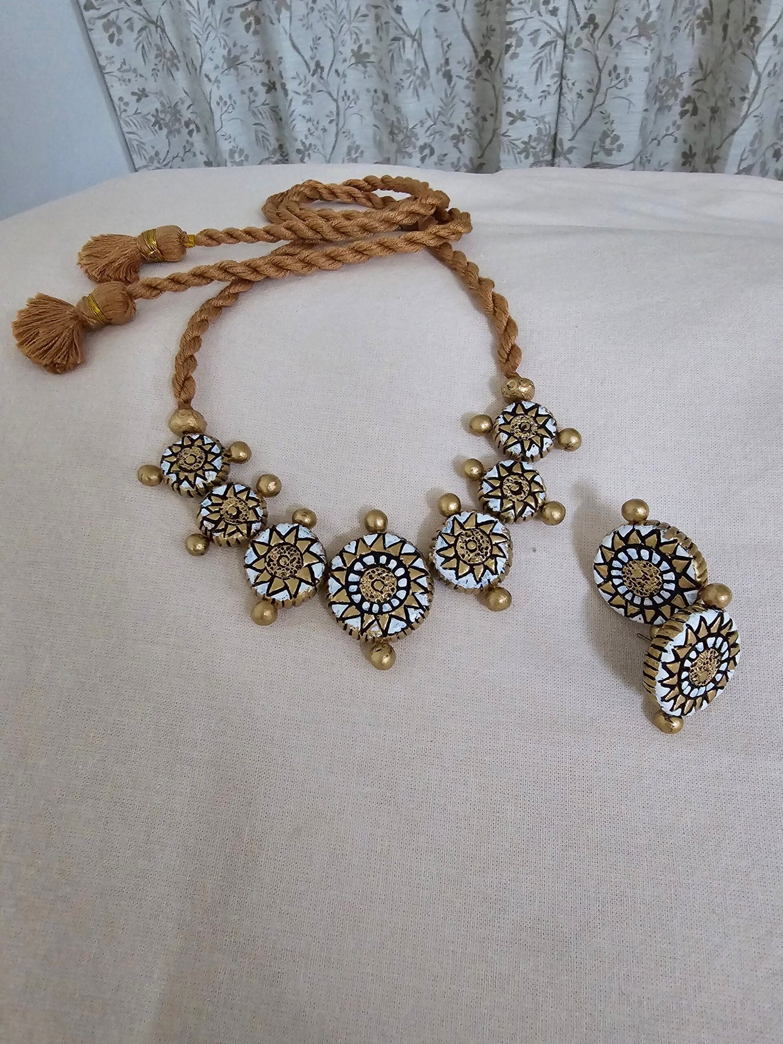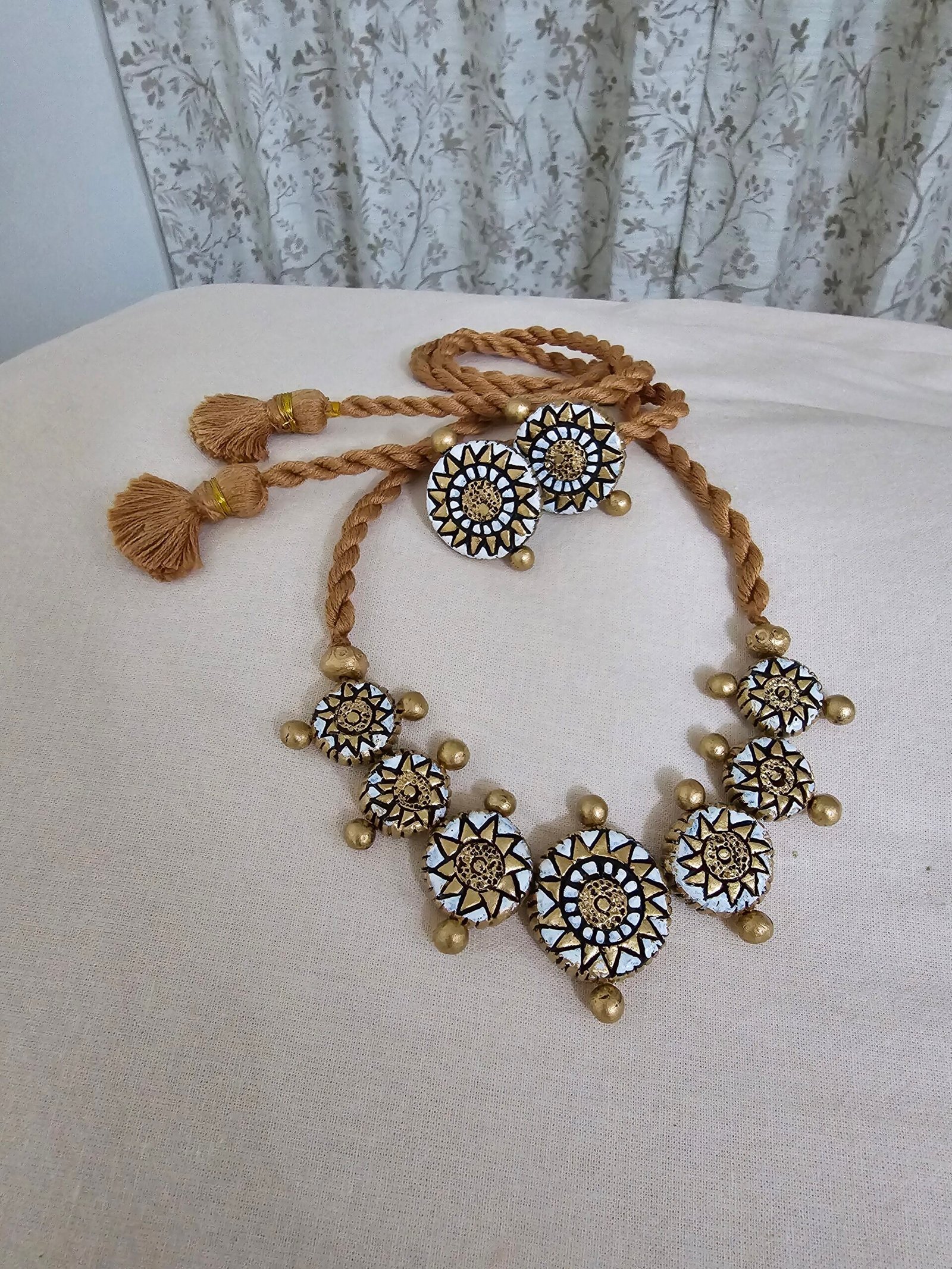 The necklace, measuring 14 cm, features intricate terracotta detailing in a harmonious palette of white, gold, and black tones, complemented by matching 2.4 cm earrings that complete the ensemble with graceful charm. For added comfort and adaptability, the necklace comes with an adjustable cotton string at the back, allowing a customized fit while maintaining the lightweight elegance of terracotta jewelry.