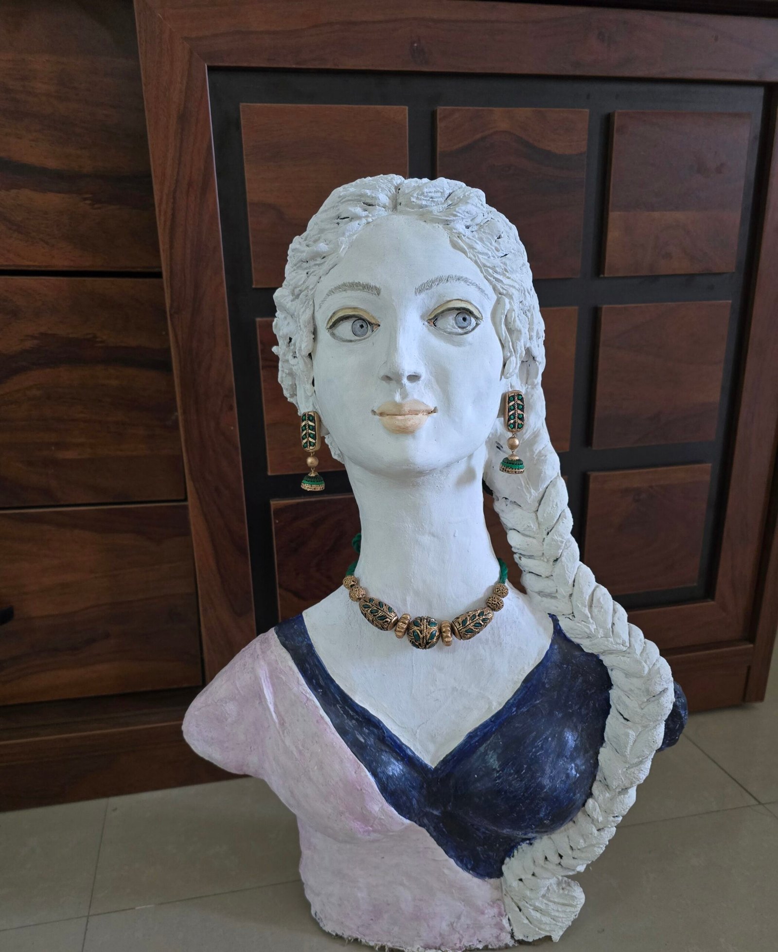 For convenience and secure wear, the necklace is finished with an adjustable string at the back, ensuring flexibility and comfort without compromising the elegance and lightweight nature of terracotta jewelry. Each piece is artisan-crafted, highlighting intricate textures, hand-applied finishes, and art-inspired detailing that elevates the set’s visual sophistication.