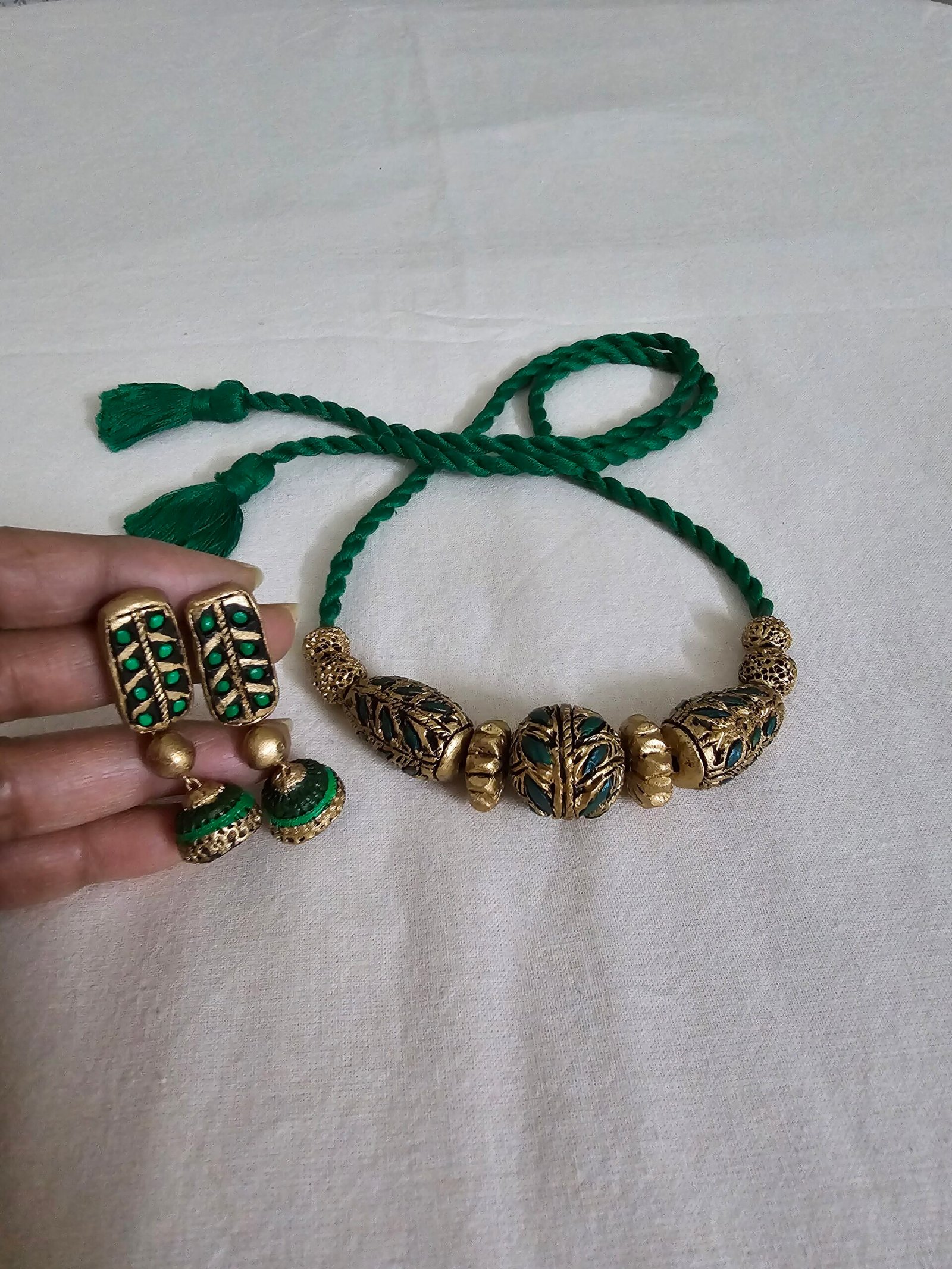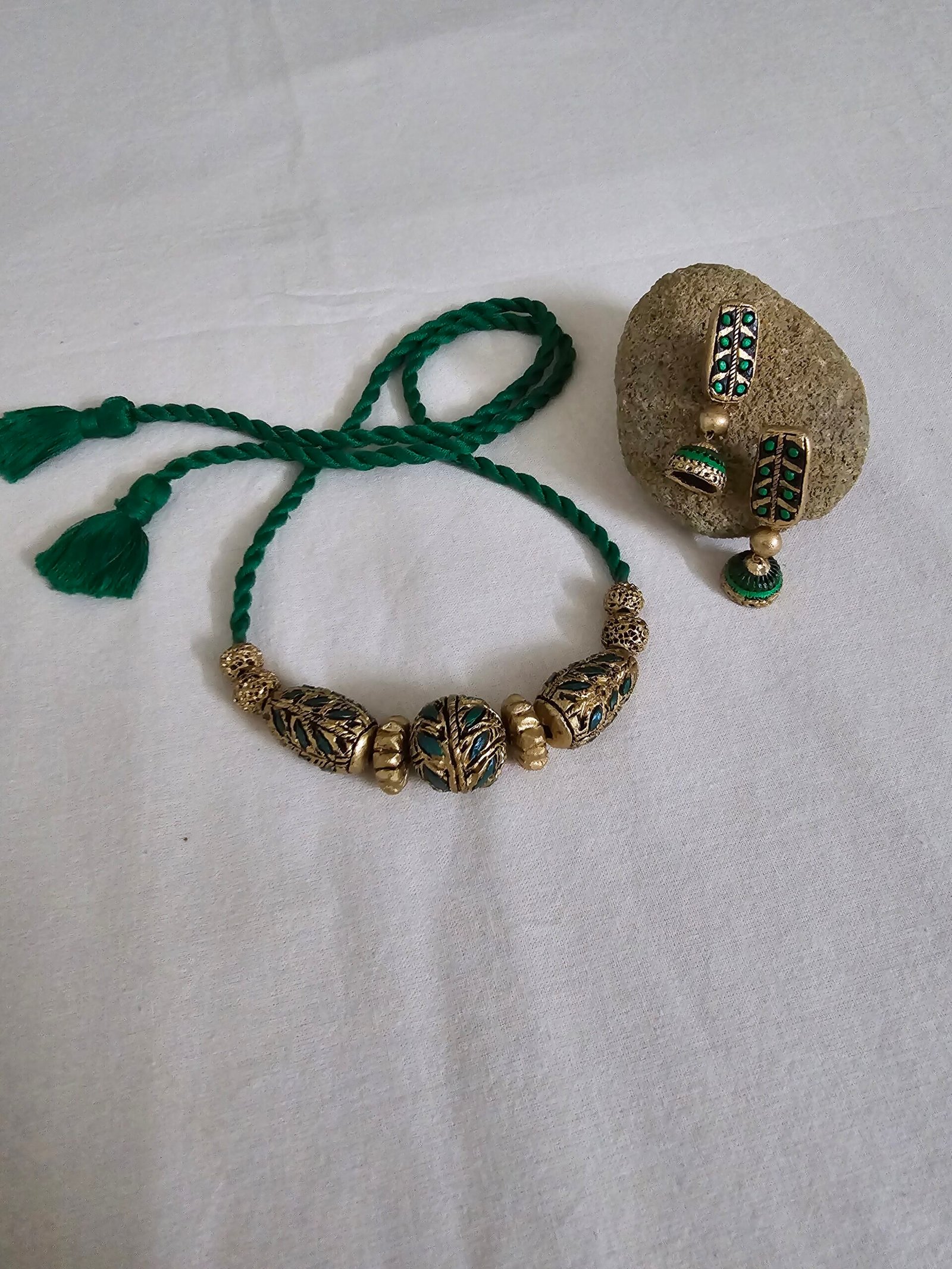 The necklace, measuring 14 cm, showcases delicately sculpted terracotta motifs in a harmonious Green, Gold, and Black palette, reflecting richness, depth, and subtle luxury. Complementing the necklace are 5 cm earrings, carefully crafted to mirror the intricate design of the necklace while offering a graceful accent that enhances the overall ensemble.