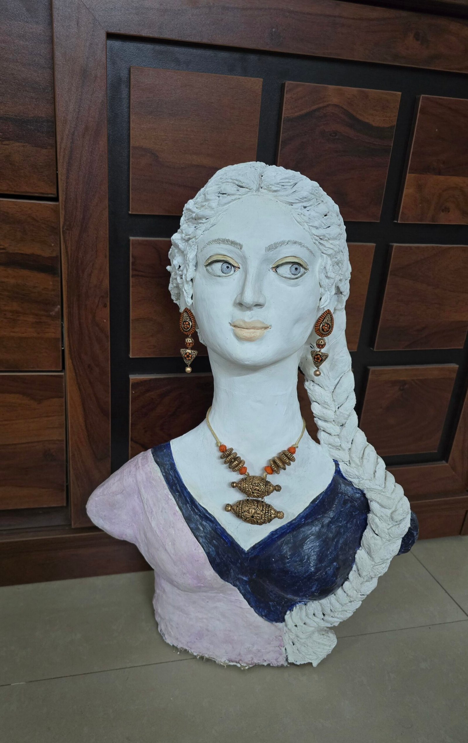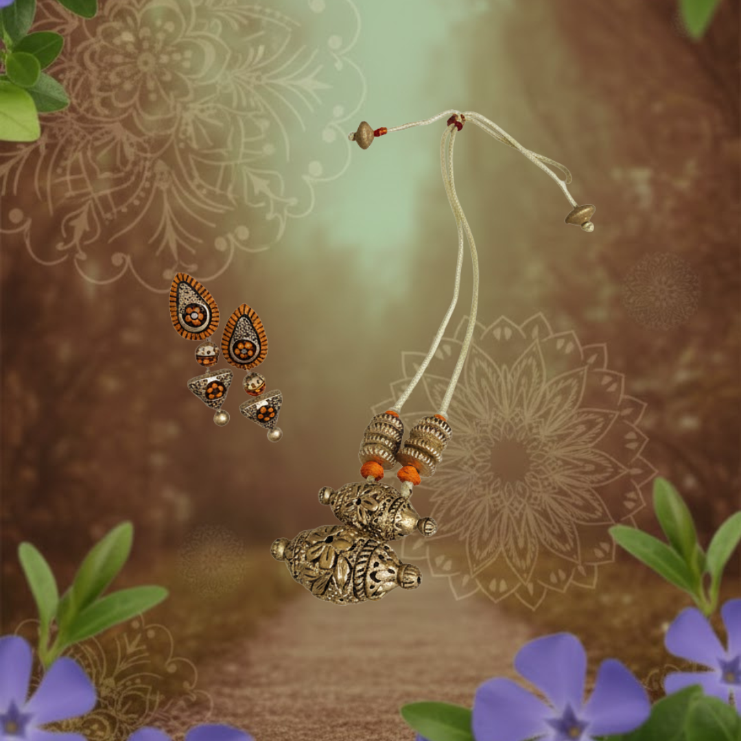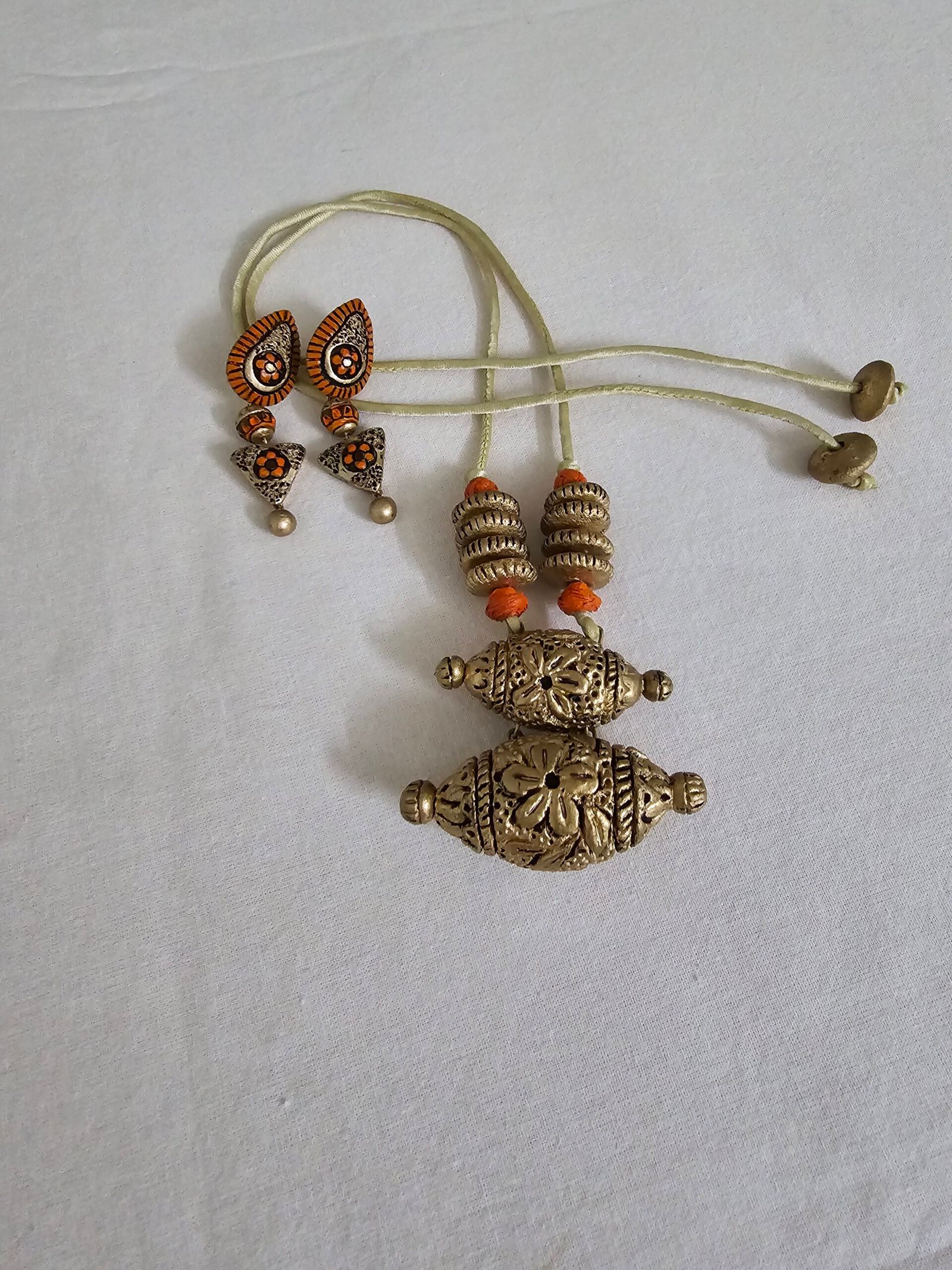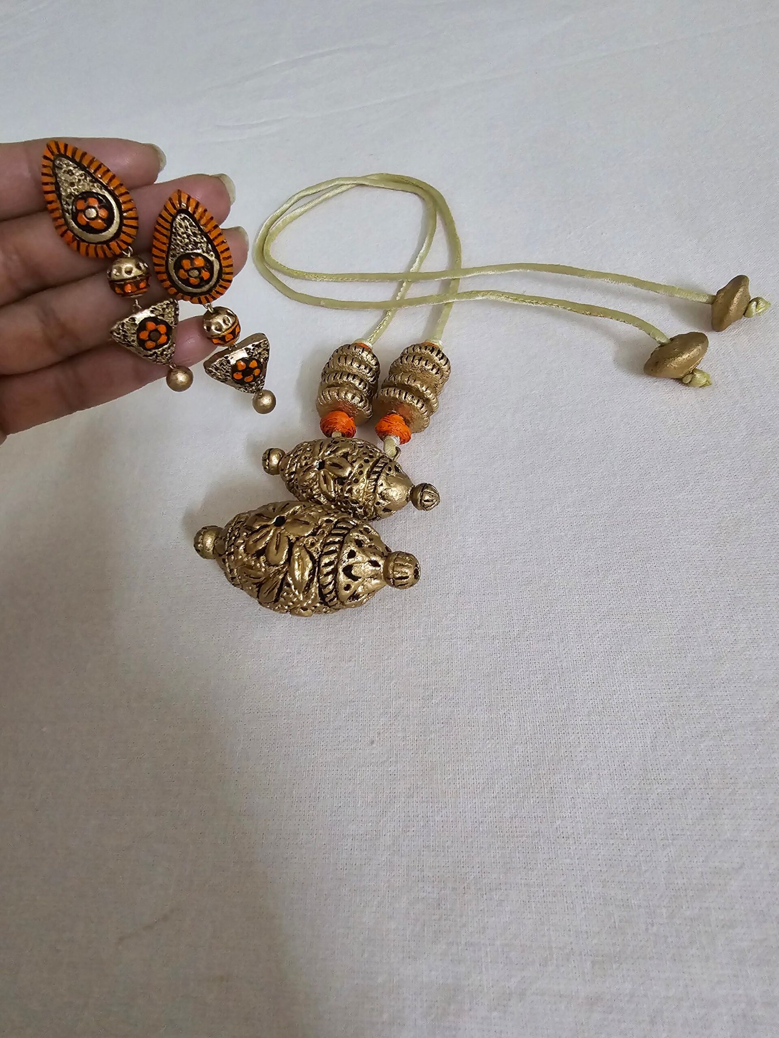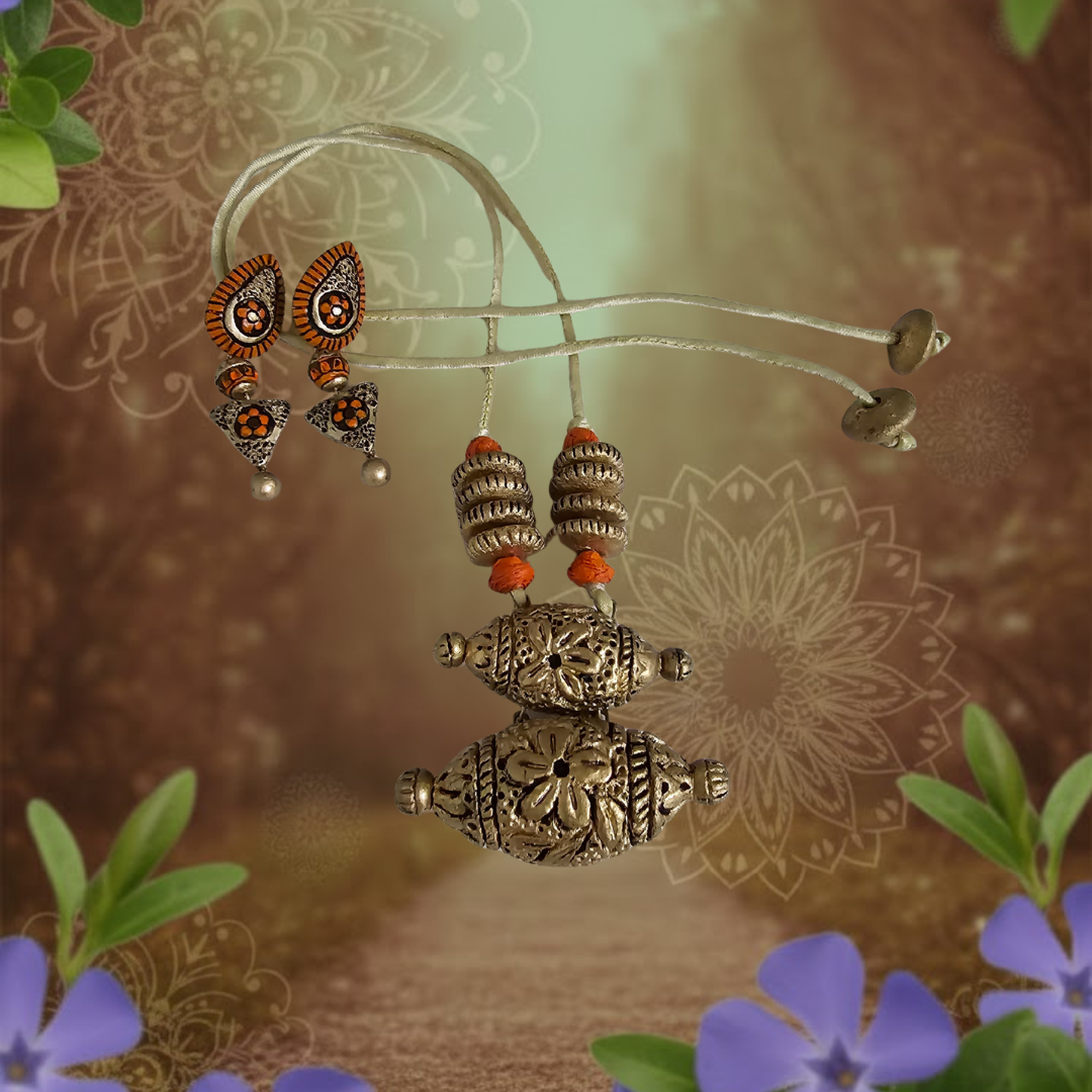 The necklace, measuring 9 cm, features delicately sculpted terracotta elements finished in a striking blend of orange, gold, and black tones, creating depth, warmth, and contrast. Paired with elongated 6.5 cm earrings, the ensemble forms a dramatic yet graceful silhouette that enhances the neckline while maintaining balanced sophistication. For comfort and adjustability, the necklace is completed with an adjustable cotton string at the back, ensuring a secure, lightweight fit for extended wear.