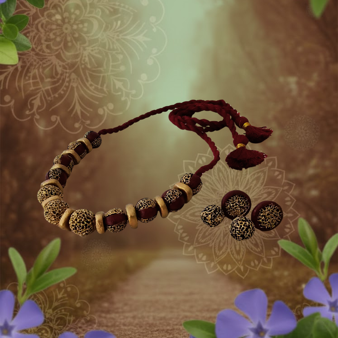 The necklace, measuring 21 cm, is meticulously handcrafted in terracotta and finished in opulent Gold and Maroon tones, colors that evoke warmth, royalty, and depth. The sculpted elements showcase refined detailing and layered textures, creating a harmonious balance between modern aesthetics and traditional craftsmanship. Complementing the necklace are elegantly proportioned 3.3 cm earrings, offering subtle movement and polished symmetry without overpowering the look.